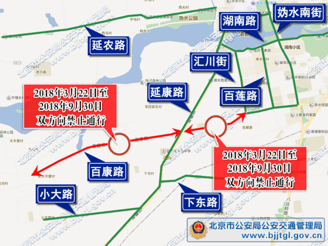 因延庆区百康路(小丰营村北口——延康路、延康路——汇川街)进行占道施工,2018年3月22日至2018年9月30日期间,百康路(小丰营村北口——延康路、延康路——汇川街)双方向禁止通行,过往车辆及行人可绕行延康路、延农路、康张路、湖南路、汇川街、百莲路、下东路、妫水南街、百康路(汇川街——妫水南街)及小大路。