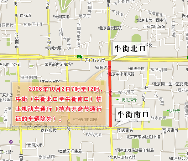 2008年10月2日(星期四)牛街礼拜寺将举办开斋节活动,为确保活动的顺利进行及道路交通安全与畅通,根据《中华人民共和国道路交通安全法》的有关规定,决定于2008年10月2日对牛街采取临时交通管理措施。现通告如下: