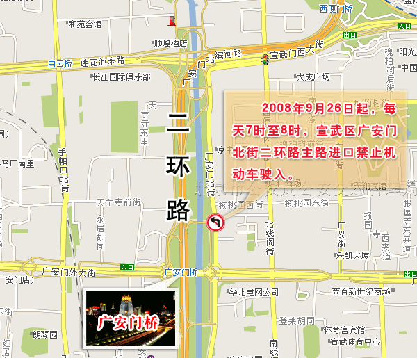 为保证宣武区广安门北街的道路交通安全与畅通,根据《中华人民共和国道路交通安全法》的有关规定,决定自2008年9月26日起,每天7时至8时,宣武区广安门北街二环路主路进口禁止机动车驶入。 特此通告。