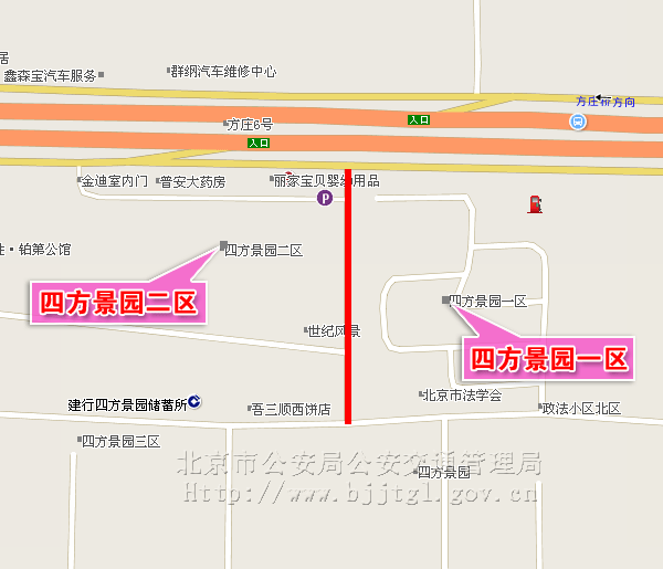 为保证丰台区四方景园一区和二区之间道路的交通安全和畅通,根据《中华人民共和国道路交通安全法》的有关规定,决定自2009年8月1日起,丰台区四方景园一区和二区之间道路禁止机动车通行(小型载客汽车除外)。