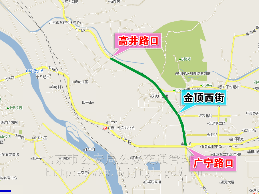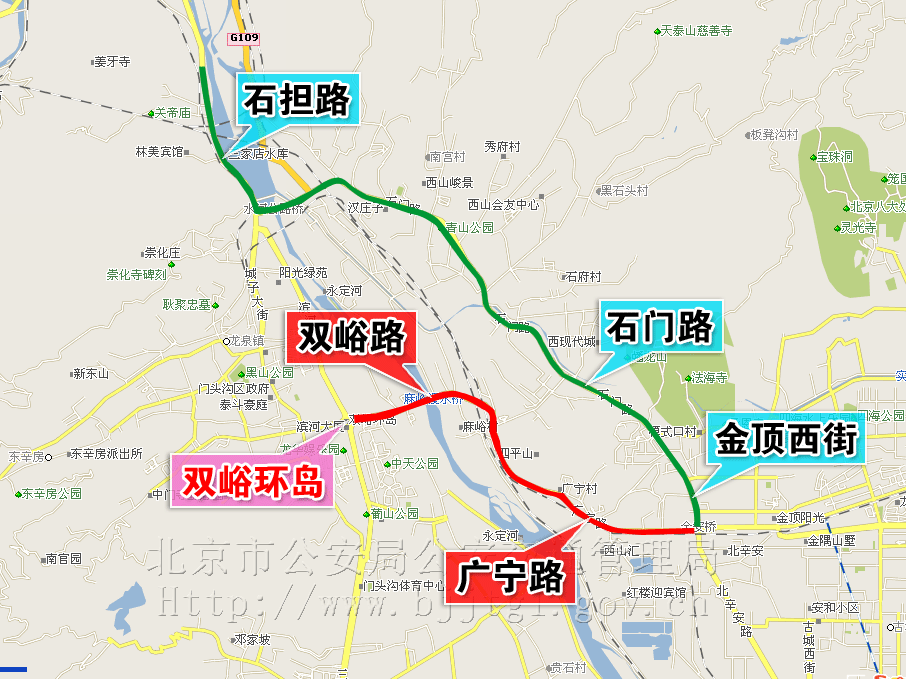 经有关部门批准,门头沟区、石景山区双峪路、广宁路将进行道路施工。为保证施工期间的道路交通安全与畅通,根据《中华人民共和国道路交通安全法》及《中华人民共和国道路交通安全法实施条例》的有关规定,决定自2009年 8月19日起至2009年12月30日止,对门头沟区、石景山区双峪路、广宁路、金顶西街部分路段采取如下交通管理措施,