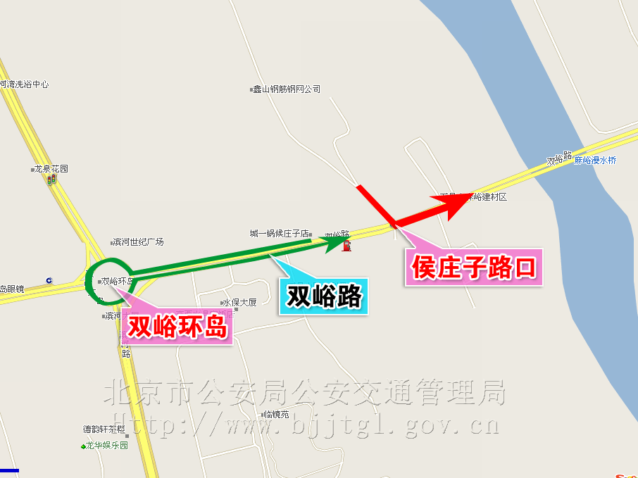 3、昼夜禁止双峪路侯庄子路口机动车由北向东左转弯,由北向东左转弯的机动车可绕行双峪环岛。