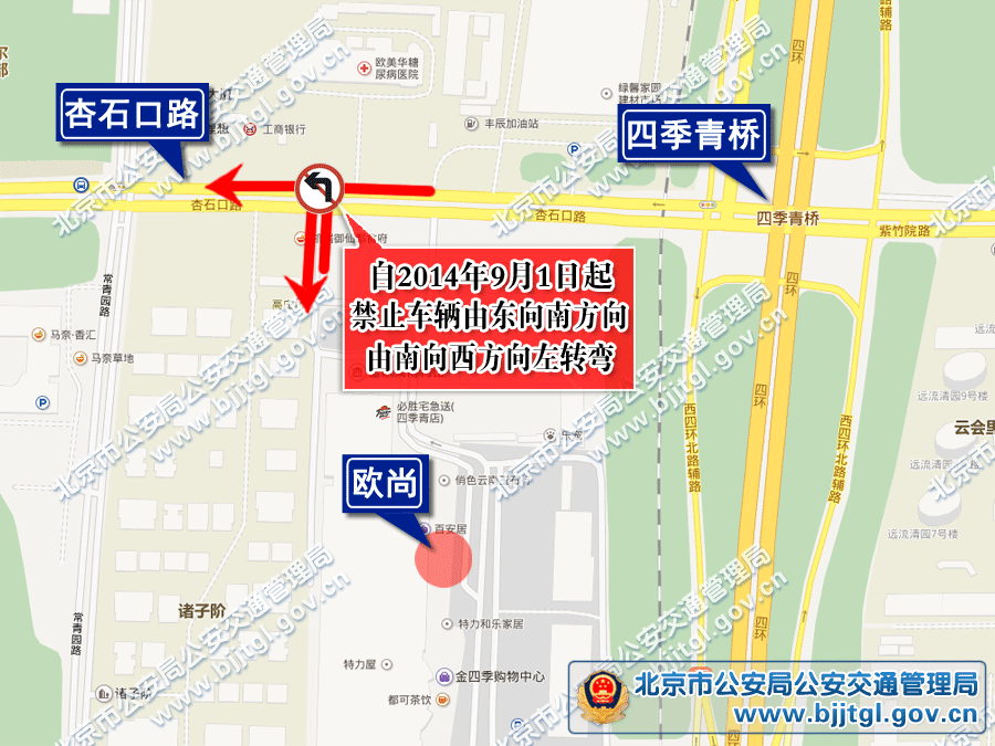 为保证海淀区杏石口路欧尚路口的交通安全与畅通,根据《中华人民共和国道路交通安全法》的有关规定,决定自2014年9月1日起,取消海淀区杏石口路四季青桥西侧欧尚交叉路口,调整为路段交通组织形式,禁止车辆由东向南方向、由南向西方向左转弯。