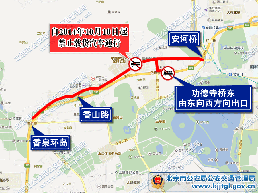 为保证海淀区香山路的道路交通安全与畅通,根据《中华人民共和国道路交通安全法》的有关规定,决定自2014年10月10日起,海淀区香山路由香泉环岛至安河桥和五环路功德寺桥东由东向西方向出口禁止载货汽车通行。