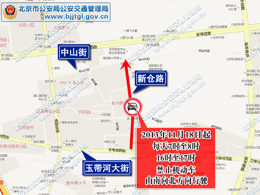 为保证通州区新仓路的交通安全与畅通,根据《中华人民共和国道路交通安全法》的有关规定,决定自2013年11月18日起,通州区新仓路(中山街至玉带河大街之间路段)每天7时至8时,16时至17时,禁止机动车由南向北方向行驶。