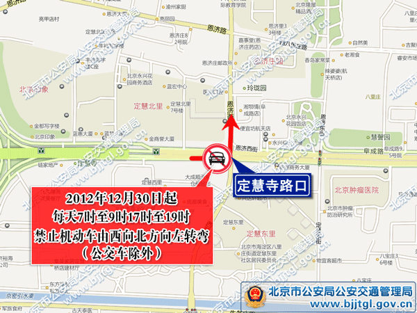 为保证海淀区定慧寺路口的交通安全与畅通,根据《中华人民共和国道路交通安全法》的有关规定,决定自2012年12月30日起,定慧寺路口每天7时至9时,17时至19时,禁止机动车由西向北方向左转弯(公交车除外)。