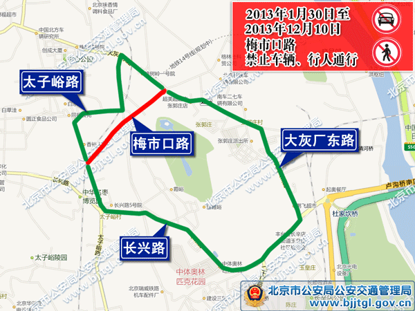 经有关部门批准,丰台区梅市口路西延部分道路将进行施工。为保证施工期间的道路交通安全与畅通,根据《中华人民共和国道路交通安全法》及《中华人民共和国道路交通安全法实施条例》的有关规定,决定于2013 年1月30日至2013年12月10日,丰台区梅市口路西延由大灰厂东路至太子峪路禁止车辆、行人通行。车辆、行人可绕行太子峪路或大灰厂东路、长兴路。