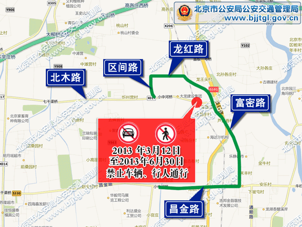 经有关部门批准,顺义区北木路与京承铁路平交道口将进行施工。为保证施工期间的道路交通安全与畅通,根据《中华人民共和国道路交通安全法》及《中华人民共和国道路交通安全法实施条例》的有关规定,决定于2013 年3月12日至2013年6月30日,顺义区北木路与京承铁路平交道口禁止车辆、行人通行。车辆、行人可绕行富密路、龙红路、区间路或昌金路。