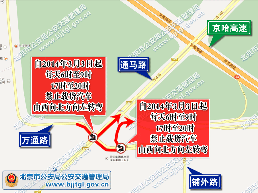 为保证通州区台湖地区的交通安全与畅通,根据《中华人民共和国道路交通安全法》的有关规定,决定自2014年3月3日起,通州区通马路与万通路相交路口、铺外路与京哈高速公路匝道交叉口,每天6时至9时、17时至20时,禁止载货汽车由西向北方向左转弯。