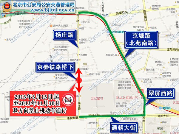 经有关部门批准,通州区杨庄路将进行道路施工。为保证施工期间的道路交通安全与畅通,根据《中华人民共和国道路交通安全法》及《中华人民共和国道路交通安全法实施条例》的有关规定,决定于2013 年3月15日起至2013年11月30日止,通州区杨庄路京秦铁路桥下双向禁止机动车通行,机动车可绕行京塘路(北苑南路)、翠屏西路、通朝大街。