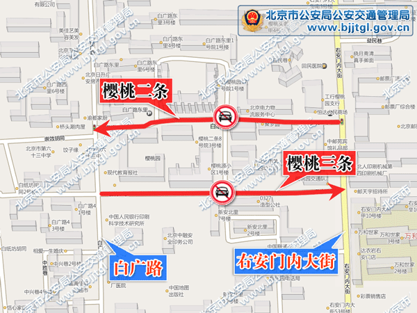 为确保西城区樱桃二条、樱桃三条的道路交通安全与畅通,根据《中华人民共和国道路交通安全法》的有关规定,决定自2011年10月10日起,樱桃二条由右安门内大街至白广路全天禁止机动车由东向西方向行驶,樱桃三条由白广路至右安门内大街全天禁止机动车由西向东方向行驶。