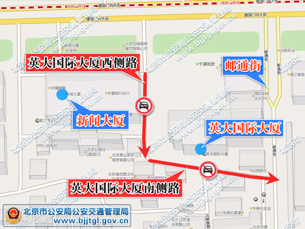 为保证东城区英大国际大厦南侧路和西侧路的交通安全与畅通,根据《中华人民共和国道路交通安全法》的有关规定,决定自2011年12月11日起,每天7时至22时,东城区英大国际大厦南侧路(邮通街至英大国际大厦西侧路之间路段)禁止机动车由西向东方向行驶,英大国际大厦西侧路(英大国际大厦南侧路至新闻大厦之间路段)禁止机动车由北向南方向行驶。
