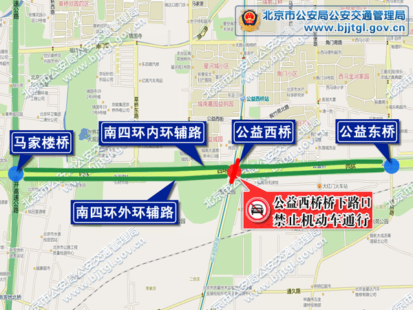 经有关部门批准,丰台区南四环公益西桥将进行改造施工。为保证施工期间的道路交通安全与畅通,根据《中华人民共和国道路交通安全法》及《中华人民共和国道路交通安全法实施条例》的有关规定,决定于2012年5月9日至 2012年5月28日,丰台区南四环公益西桥桥下路口禁止机动车通行。机动车可经南四环内、外环辅路绕行马家楼桥、公益东桥。