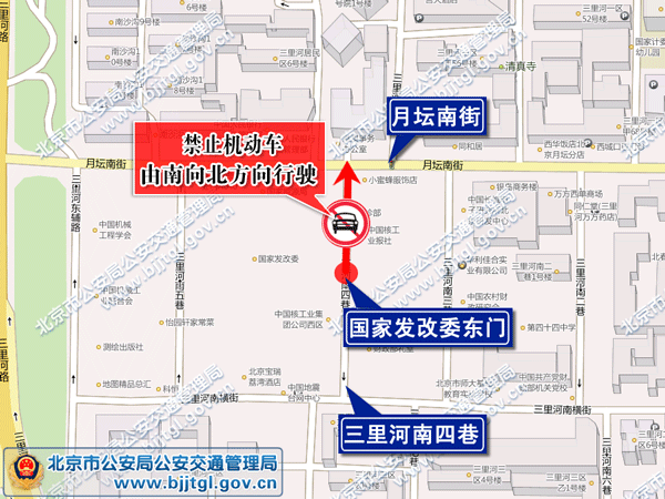 关于西城区三里河南四巷北段禁止机动车由南向北行驶的通告