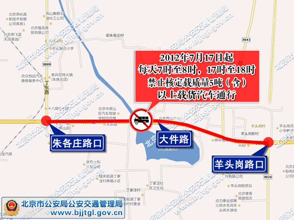 为确保房山区大件路的道路交通安全与畅通,根据《中华人民共和国道路交通安全法》的有关规定,决定自2012年7月17日起,房山区大件路(羊头岗路口至朱各庄路口之间路段),每天7时至8时,17时至18时,禁止核定载质量5吨(含)以上载货汽车通行。