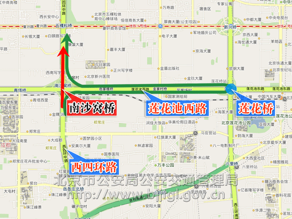 一、自2010年10月29日起至2010年11月1日止,每天0时至5时,西四环路南沙窝桥桥下主路北向南方向禁止机动车通行。机动车可绕行莲石东路,在莲玉桥调头后返回南沙窝桥行驶。