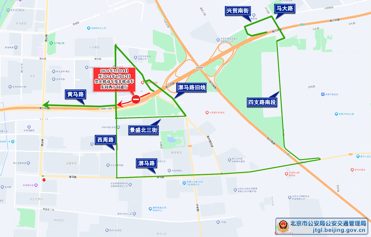为保证通州区马驹桥镇2023年公路大修2号桥与3号桥联络线大修工程施工期间的道路交通安全与畅通,根据道路交通安全法律法规有关规定,决定2024年5月14日至2024年6月12日,通州区黄马路(漷马路旧线至西周路段)东向西方向禁止机动车及非机动车通行,过往车辆可绕行漷马路旧线、景盛北三街、兴贸南街、马大路、四支路南段、漷马路、西周路等周边道路通行。