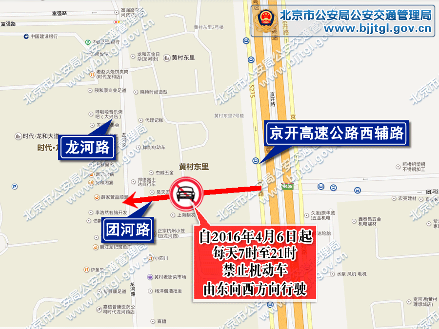 一、团河路(龙河路至京开高速公路西辅路之间路段),每天7时至21时,禁止机动车由东向西方向行驶;