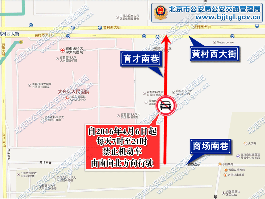 二、育才南巷(黄村西大街至商场南巷之间路段),每天7时至21时,禁止机动车由南向北方向行驶。