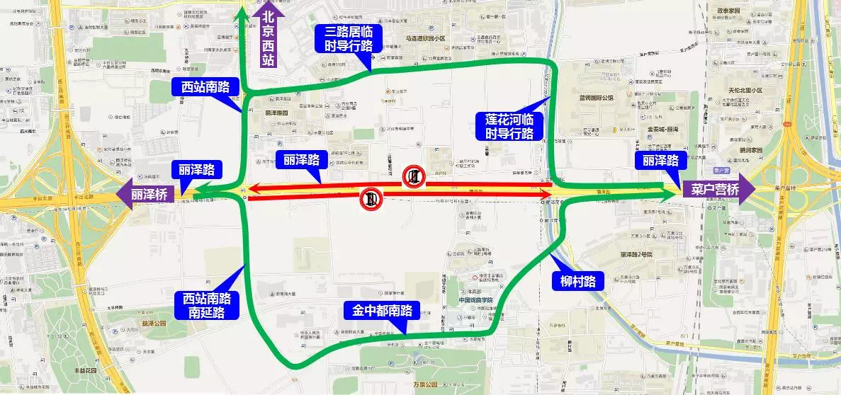 一、自2016年12月24 日0时起至2017年9 月30 日24时止,丽泽路(三路居临时导行路南口至莲花河临时导行路南口)禁止车辆及行人通行。由西向东方向车辆及行人可绕行北京西站南路南延路、金中都南路、柳村路、丽泽路;由东向西方向车辆及行人可绕行莲花河临时导行路、三路居临时导行路、丽泽路。