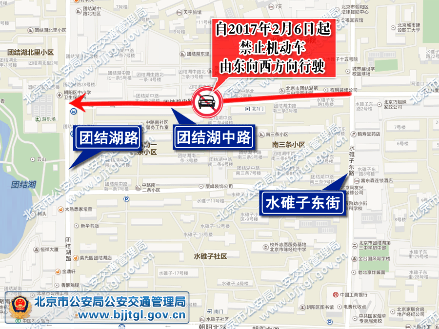 为保证朝阳区团结湖中路的交通安全与畅通,根据《中华人民共和国道路交通安全法》的有关规定,决定自2017年2月6日起,朝阳区团结湖中路(团结湖路至水碓子东街),禁止机动车由东向西方向行驶。