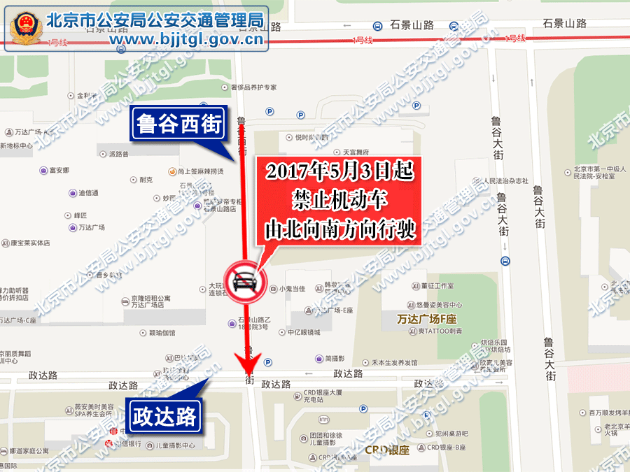 为保证石景山区鲁谷西街的交通安全与畅通,根据《中华人民共和国道路交通安全法》的有关规定,决定自2017年5月3日起,鲁谷西街(政达路至万达商城地下车库入口)禁止机动车由北向南方向行驶。
