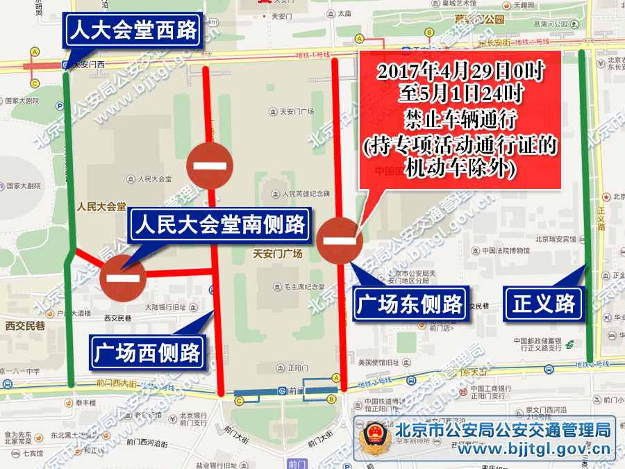 4月29日0时至5月1日24时,广场东侧路、广场西侧路、人大会堂西路(人民大会堂南侧路段)禁止车辆通行(持专项活动通行证的机动车除外),过往车辆(含公共电、汽车)绕行正义路和人大会堂西路。
