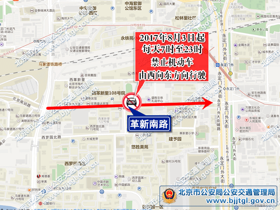 为保证东城区革新南路的交通安全与畅通,根据《中华人民共和国道路交通安全法》的有关规定,决定自2017年8月3日起,东城区革新南路禁止机动车由西向东方向行驶时间由7时至17时调整为7时至23时。