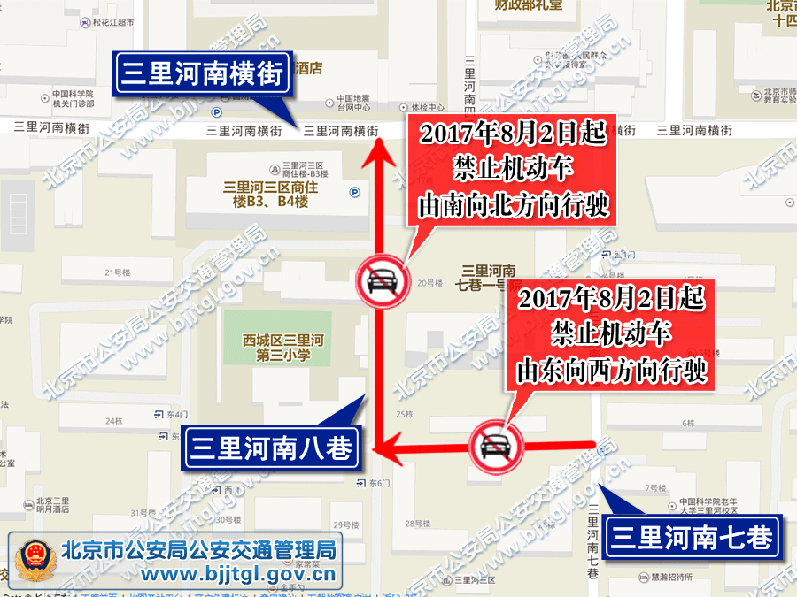 为保证西城区三里河南八巷的交通安全与畅通,根据《中华人民共和国道路交通安全法》的有关规定,决定自2017年8月2日起:
