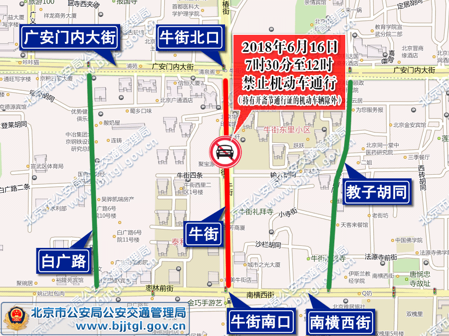 2018年6月16日(星期六)牛街礼拜寺将举办开斋节活动。为确保活动的顺利进行及道路交通安全与畅通,根据《中华人民共和国道路交通安全法》的有关规定,决定于2018年6月16日对牛街采取临时交通管理措施。现通告如下: