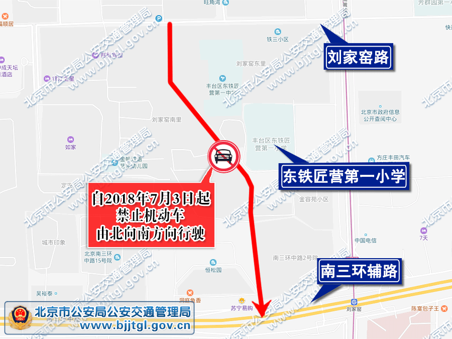为保证丰台区东铁匠营第一小学西侧道路的交通安全与畅通,根据《中华人民共和国道路交通安全法》的有关规定,决定自2018年7月3日起,丰台区东铁匠营第一小学西侧道路(刘家窑路至南三环辅路)禁止机动车由北向南方向行驶。