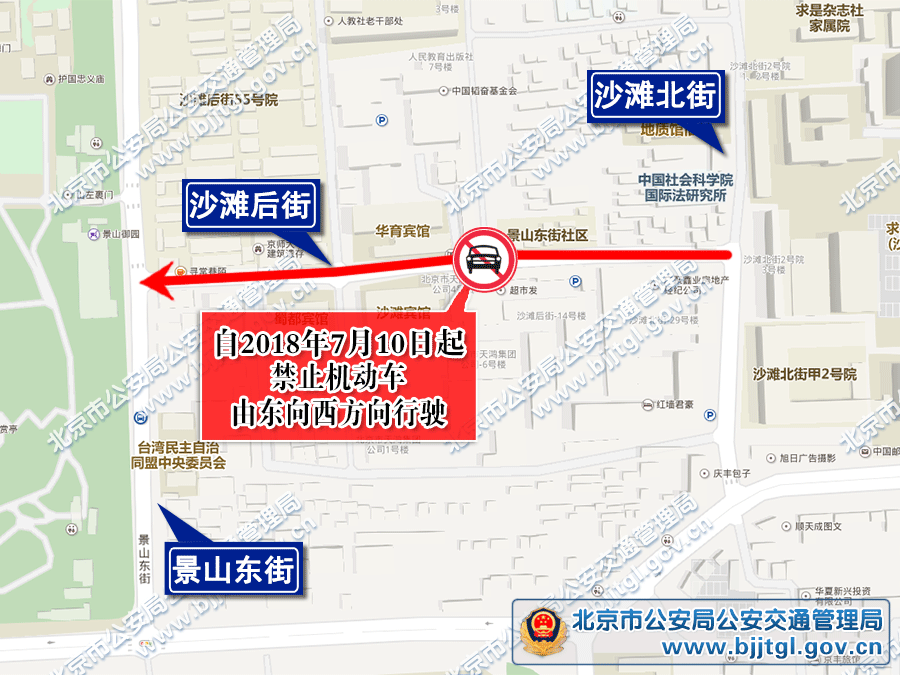 为保证东城区沙滩后街的交通安全与畅通,根据《中华人民共和国道路交通安全法》的有关规定,决定自2018年7月10日起,对沙滩后街(景山东街至沙滩北街段)采取禁止机动车东向西方向行驶的交通管理措施。