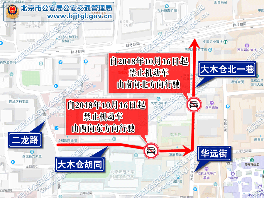 为保证西城区大木仓胡同、大木仓北一巷的交通安全与畅通,根据《中华人民共和国道路交通安全法》的有关规定,决定自2018年10月16日起,对大木仓胡同和大木仓北一巷采取以下交通管理措施: