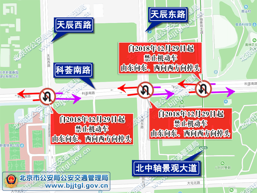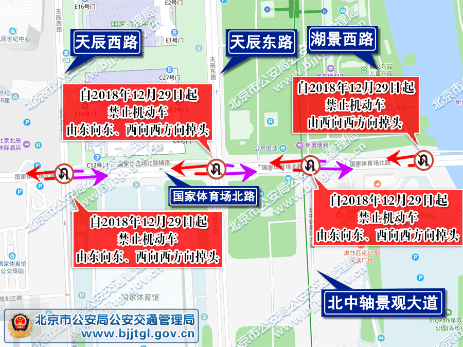 1.国家体育场北路与天辰西路交叉口禁止机动车由东向东、西向西方向掉头。