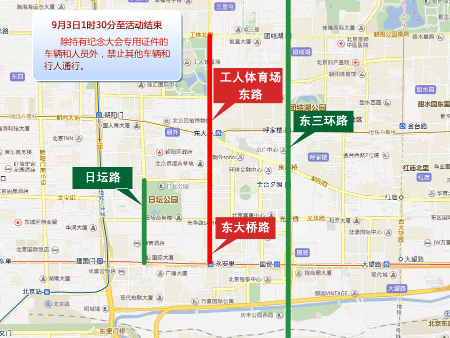 七、9月3日1时30分至活动结束,工人体育场东路;东大桥路,除持有纪念大会专用证件的车辆和人员外,禁止其他车辆和行人通行。车辆可分别绕行日坛路、东三环路。