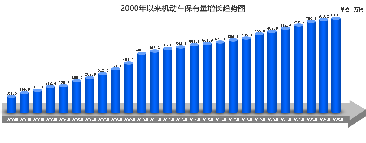 据统计,截止到2025年底,本市机动车保有量为810.1万辆,比2024年增加21.9万辆,上升2.28%。与2000年底比较,25年来机动车保有量增加了652.3万辆。