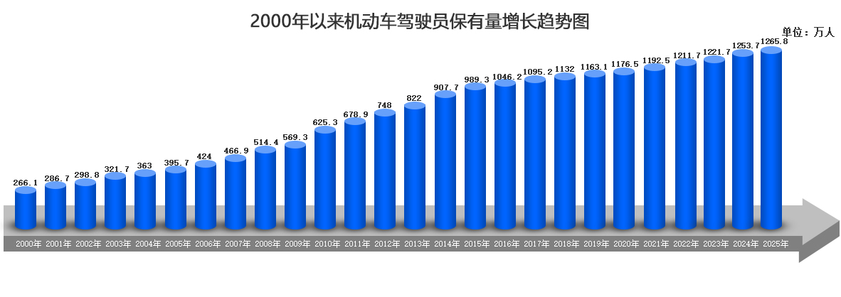 截止到2025年底,本市机动车驾驶员为1265.8万人,比2024年增加12.1万人,上升0.96%。与2000年底比较,25年来驾驶员保有量增加了999.7万人。